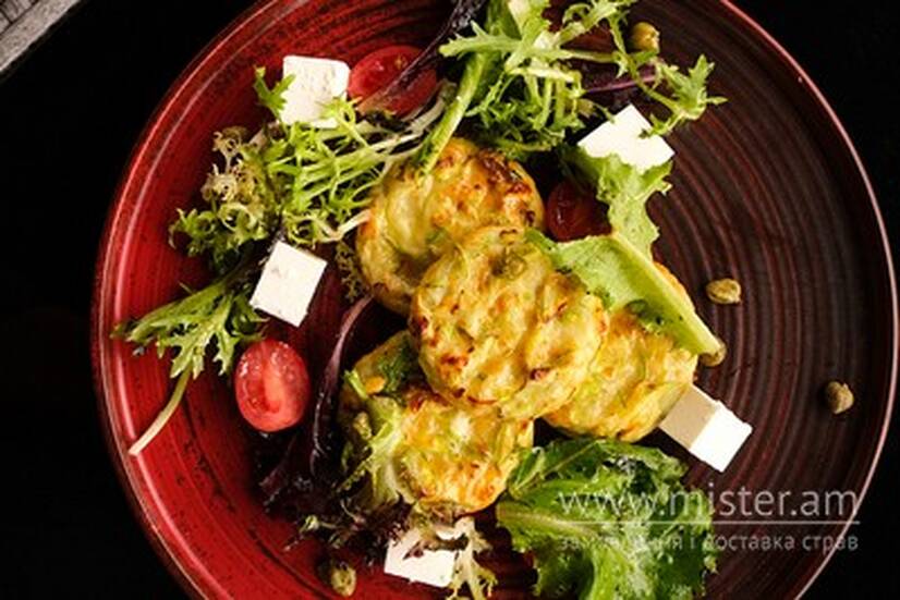 Оладки із кабачків, сир фета, соус "Песто", помідор чері, зелень.
