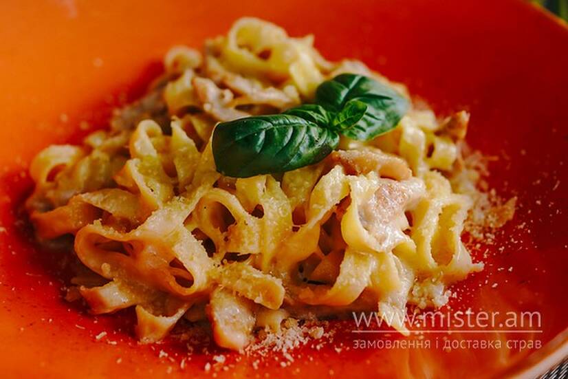 Паста, курка, білі гриби, пармезан, вершковий соус.