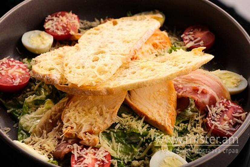 Ромен, айсберг, соус "Цезар", яйце перепелине, куряче філе, бекон, помідор чері, пармезан.