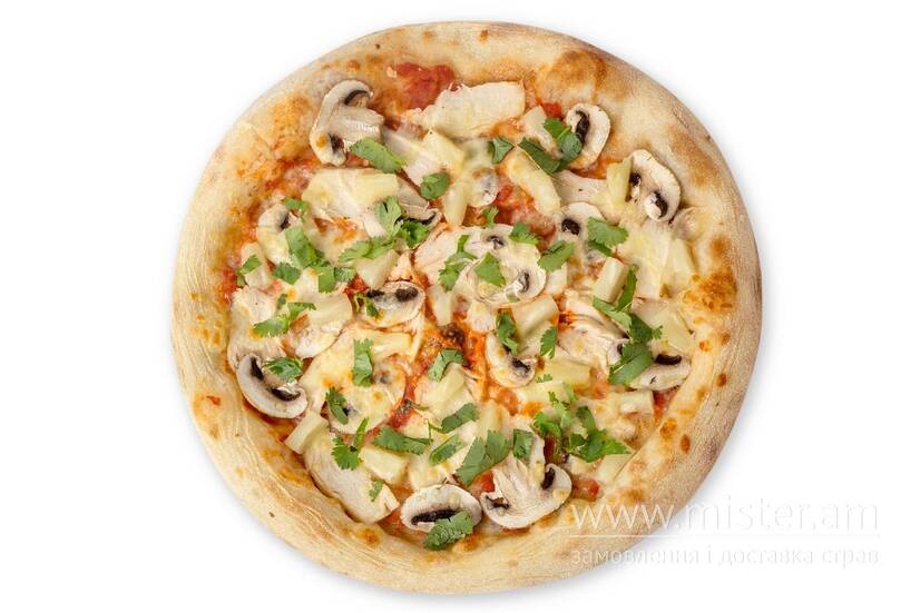 Соус "Сімейний", м`ясо курки, печериці, моцарела, ананас, зелень.
