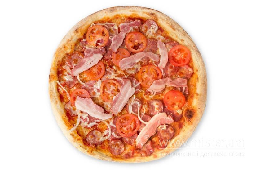 Соус "Сімейний", салямі, шинка, цибуля маринована, моцарела, помідор, бекон.