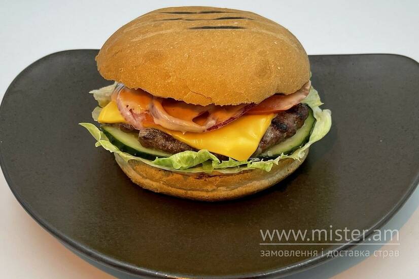 Булка, яловичина, огірок свіжий, помідор свіжий, салат Айсберг, синя цибуля, сир Чеддер, соус.