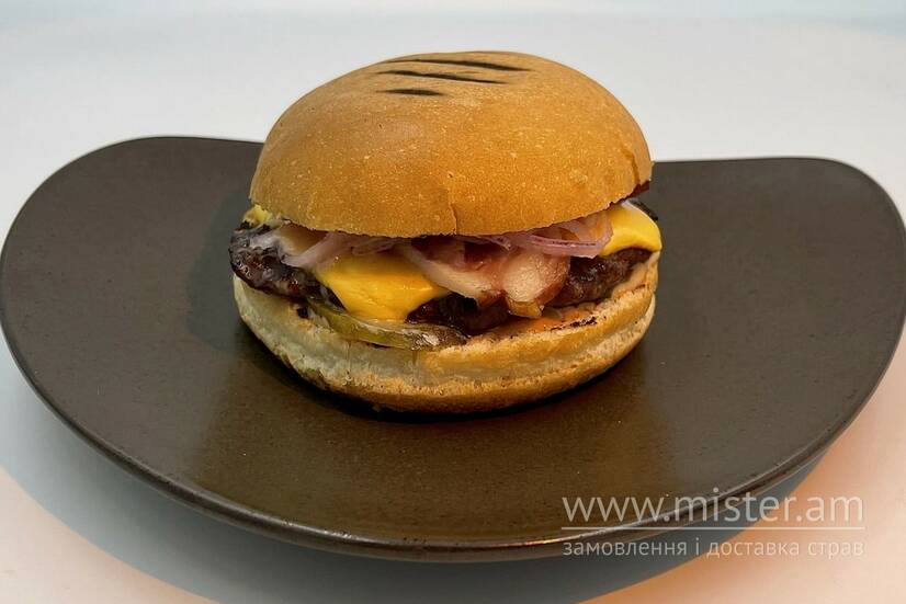 Булка, яловичина, огірок квашений, сир Чеддер, бекон чіпси, соус.