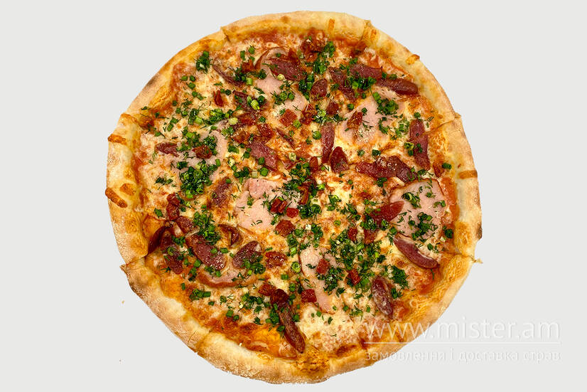 Моцарелла Fior di Latte, італійські ковбаски, шинка, пармезан, томати Pelati, зелена цибуля, зелень.