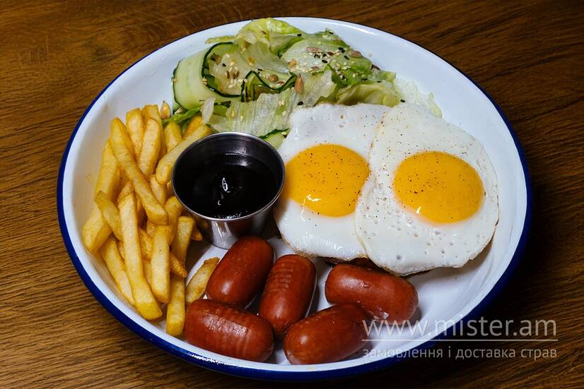 Крафтова булочка, сир чеддер, картопля фрі, яйця глазунья, айсберг, огірок слайсами, соус діжон, мікс насіння, сосиски міні, подається з соусом ббк.