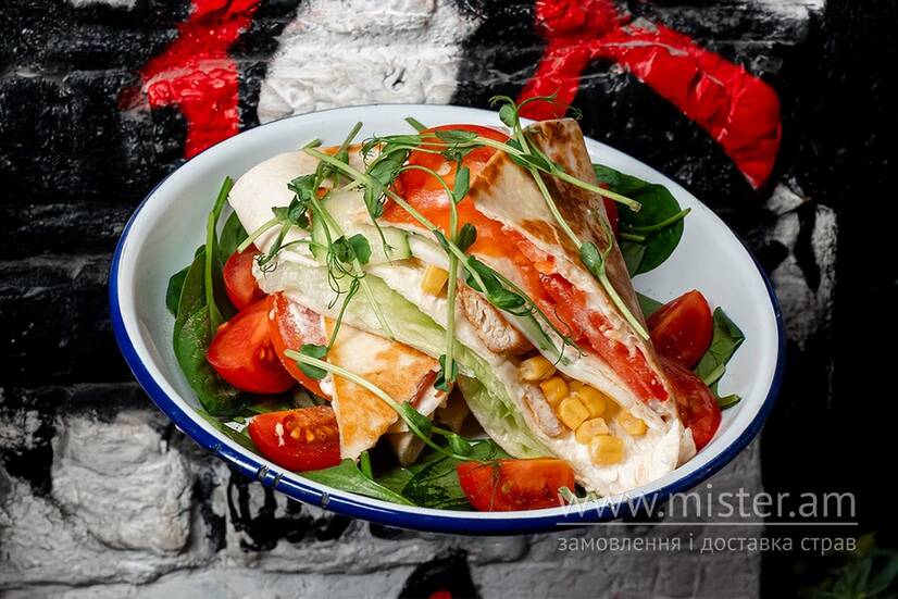 Тортилья, курка, крем сир, кукурудза, сир моцарелла, салат айсберг, свіжий огірок, помідори прикрашається мікрогріном. Салатна подушка зі шпинату та помідор чері.
