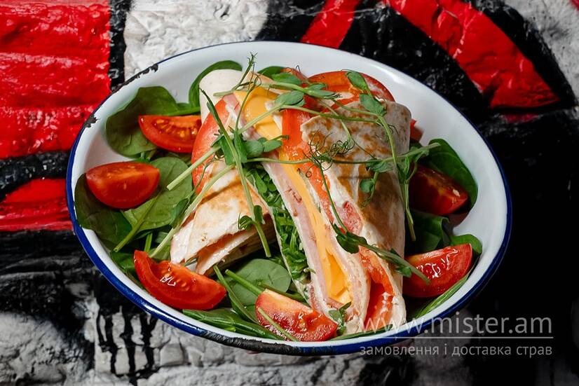 Тортилья, шинка, крем-сир, сир чеддер, свіжі огірки, рукола, помідори прикрашається мікрогріном. Салатна подушка зі шпинату та помідор чері.