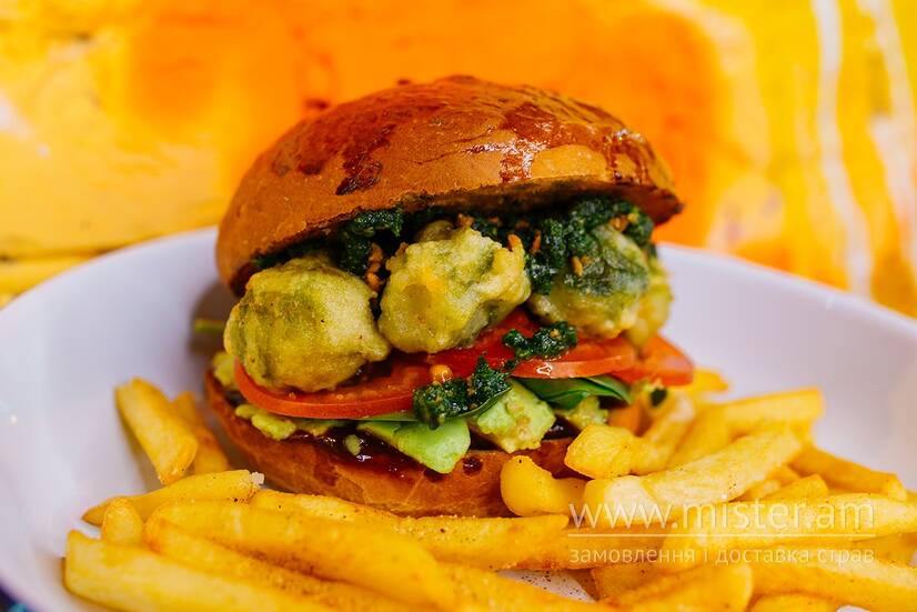 Булка, шпинат бейбі, авокадо, брюсельська капуста в темпурі, томати, соус песто, соус ббк, хрустка цибуля подається з картоплею фрі.