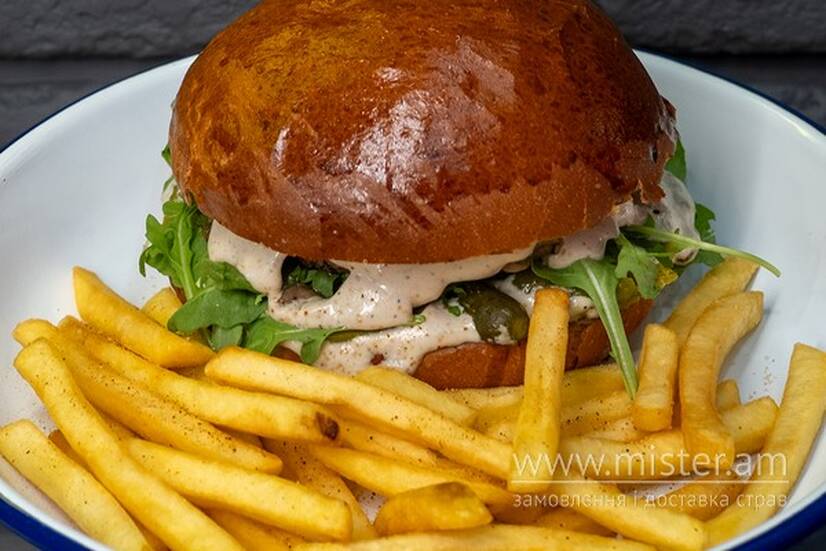 Булка, котлета яловича, грибний соус, сир чеддер, гриби смажені, беконовий джем, корнішони, рукола, подається з картоплею фрі.