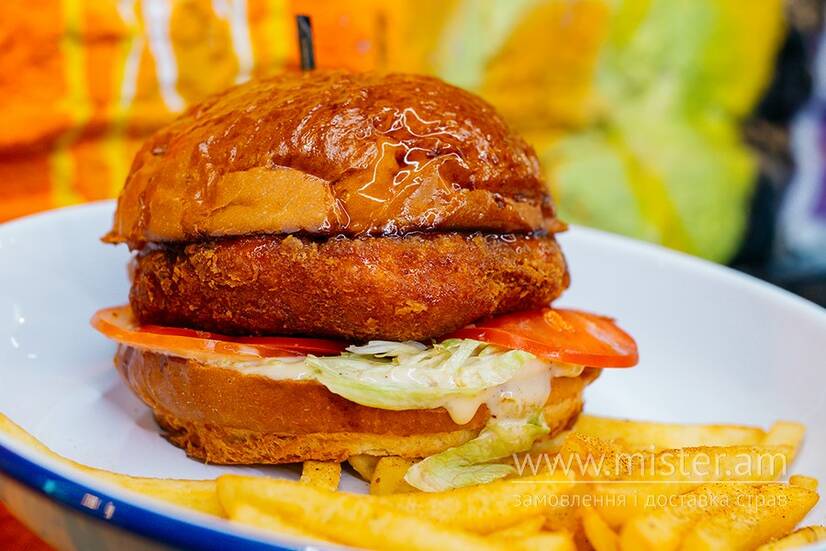 Булка, куряче філе в паніровці, помідори, салат айсберг, соус солодкий чілі, соус айолі, соус шрірача, хрустка цибуля подається з картоплею фрі.