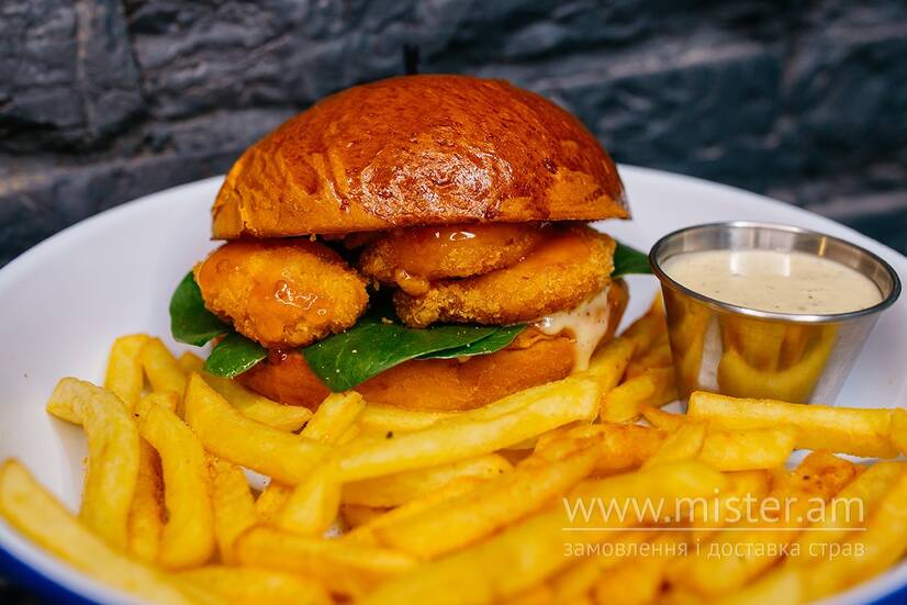 Булка, креветка в паніровці, бейбі шпинат, соус солодкий чілі, соус айолі, соус шрірача, хрустка цибуля, подається з соусом айолі та картоплею фрі.