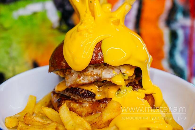 Булка, 2 котлети з яловичини, сир чеддер, бекон, беконовий джем, хрустка цибуля, соус айолі подається з картоплею фрі та сирним соусом.