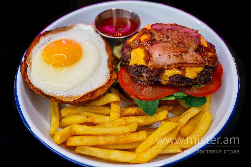 Булка, котлета з яловичини, сир чеддер, беконовий джем, карамелізована цибуля, шпинат бейбі, помідори, бекон, огірки мариновані, яйце, соус ббк, подається з картоплею фрі і томатним соусом.