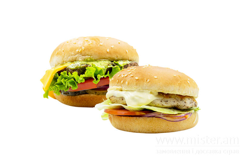 Два соковитих міні-бургери. Міні-бургер з телятиною: котлета з телятини, сир Чеддер, мариновані огірки, салат Айсберг, синя цибуля, кетчуп та огірковий соус,основою якого є:вершки,маринований огірок та часник. Міні-бургер з куркою: ніжне куряче філе, салат Лола, томати, синя цибуля, сметанно-гірчичний соус. Ідеальний дует для тих, хто хоче спробувати одразу два смаки.
