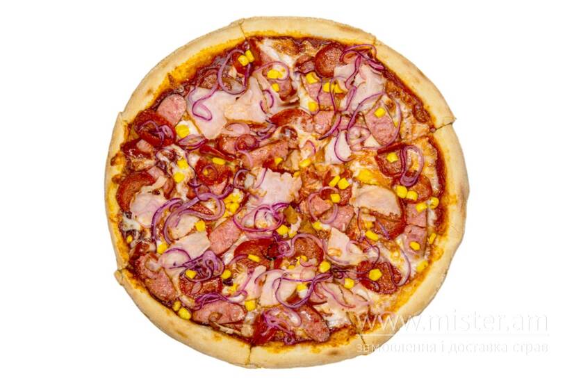 Крафтове тісто, італійський томатний соус, соус BBQ, салямі папероні, шинка, мисливські ковбаски, моцарела, маринована синя цибуля та кукурудза — насичений смак з ароматом грилю.