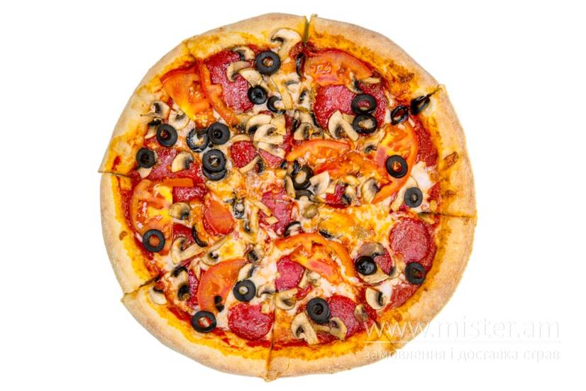 Крафтове тісто, італійський томатний соус, салямі папероні, моцарела, печериці, помідори та маслини.