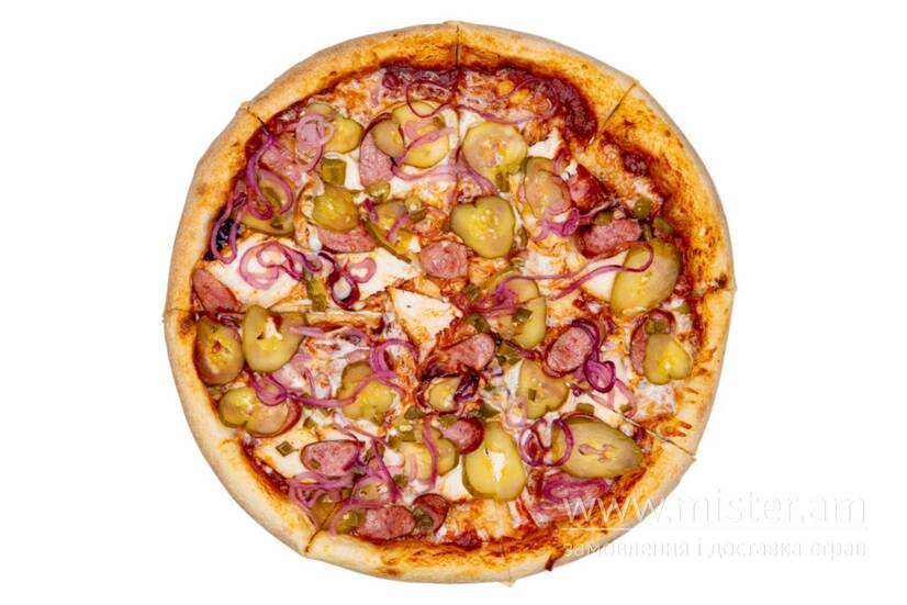 Крафтове тісто, італійський томатний соус, соус BBQ, мисливські ковбаски, курка су-від, моцарела, гострий перець халапеньо, мариновані огірки та синя цибуля — яскраве поєднання смаків з легкою гостринкою.