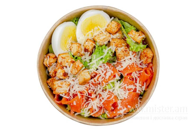 Мікс салату, лосось, крутони, яйце, соус цезар, сир пармезан.