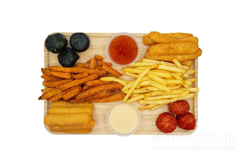 Сирні кульки Хабанеро, сирні кульки Халапеньйо, батат фрі, картопля фрі, стріпси кальмара, сирні палички Чедер, соус кисло-солодкий, соус фірмовий.