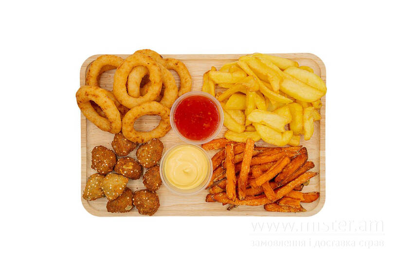 Цибулеві кільця, фалафель, батат фрі, картопляні діпи, соус світ чілі, соус кисло-солодкий.