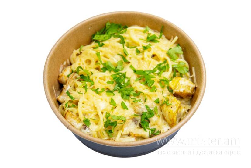 Спагеті в ніжно-вершковому соусі з маринованим курячим філе та печерицями, посипані пармезаном та петрушкою.