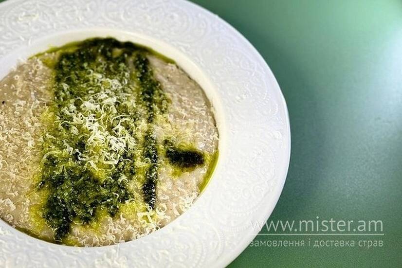 ВІвсянка з соусом песто власного виробництва з додаванням сиру горгонзола та пармезану.