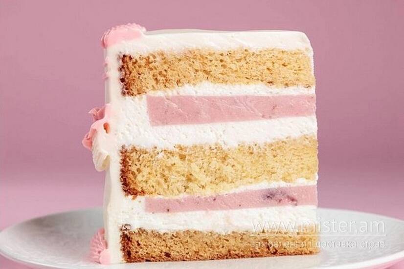 Ніжний бісквіт з полуничним кюлі, крем-чізом та полуничним суфле.