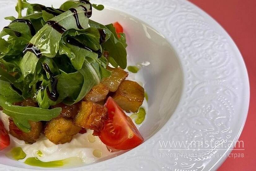 Салат з печеним баклажаном та перцем, з свіжими томатами, фермерським сиром страчателла та соусом sweet chilli.