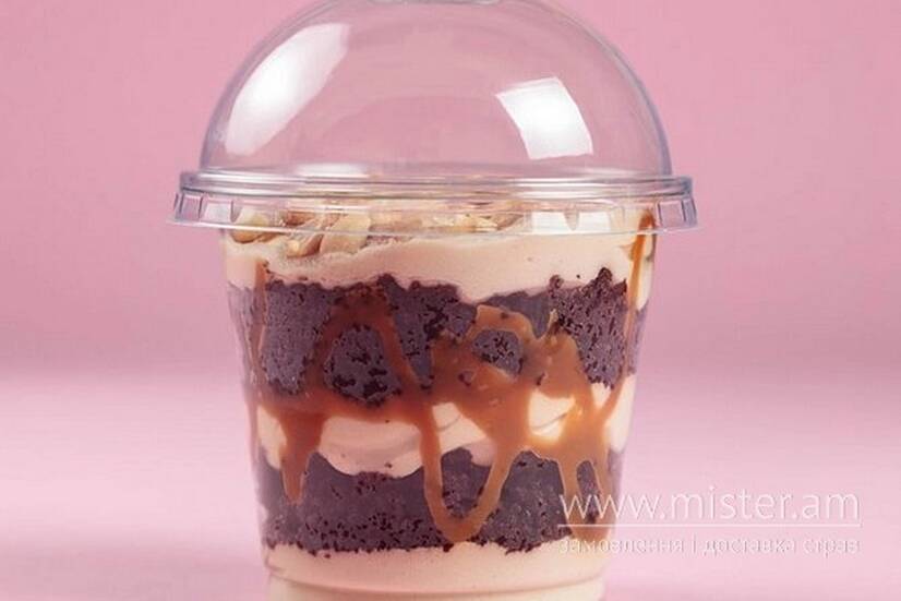 Запашний шоколадний бісквіт, крем чіз зі згущеним молоком, арахіс та солона карамель.