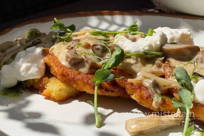 Хрусткі деруни під ароматним вершковим соусом з грибів (печериць, глив, білих) з солоною бринзою прикрашені зеленою олією та мікрогріном.