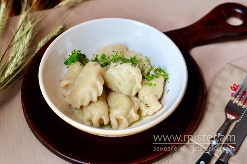 Вареники на заварному тісті, з начинкою з картоплі, смаженої цибулі та кропу, подаються з хрусткою смаженою цибулею.