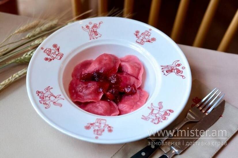 Солодкі вареники з вишнями, на заварному тісті, подаються з вишневим соусом.