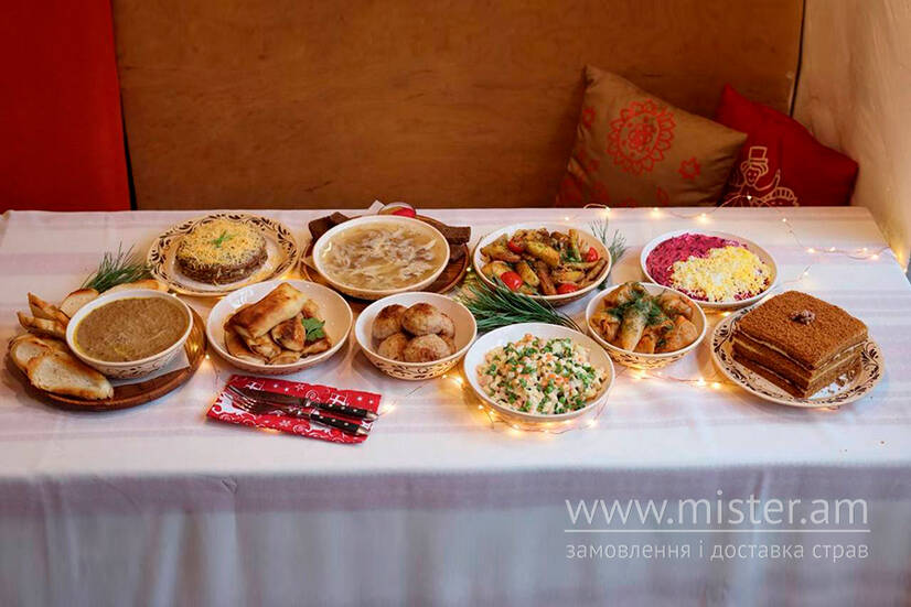 Домашній холодець з півня та рульки 500 г, Олів`є з шинкою та куркою 1000 г, Оселедець під шубою 500 г, курячий паштет 300 г, печінковий торт 500 г, голубці 500 г, котлети курячі 500 г, млинці з шинкою та сиром 500 г, картопля з підчеревиною 500 г, Медовик 500 г.