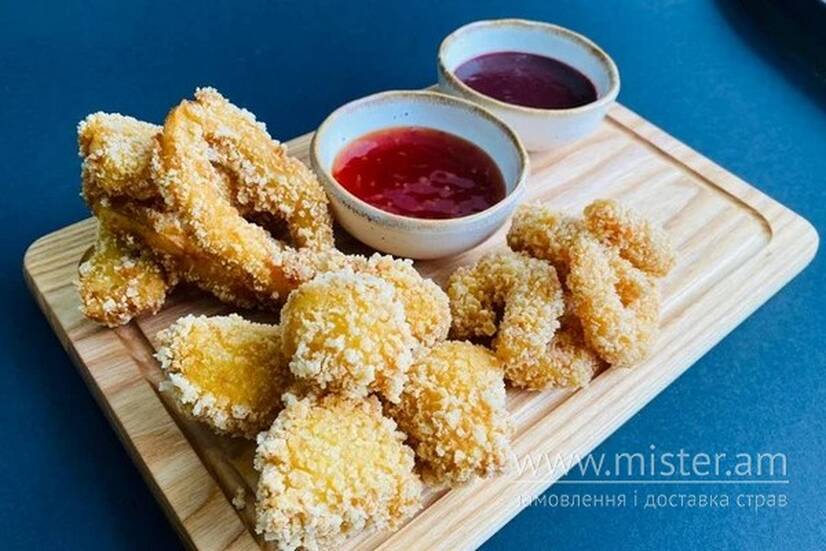 Тигрова креветка смажена у фритюрі. Подається з соусом Тар-тар.