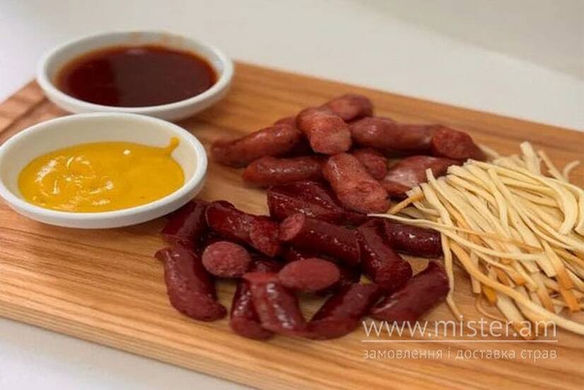 Сет із курячими ковбасками, баварськими сосисками та сиром чечель. Подається з американською гірчицею та соусом BBQ.