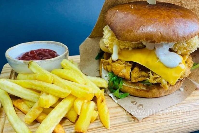 Ніжна куряча котлета фрі з солоними огірочками, цибулевими кільцями, сирними паличками, сиром чеддер та міксом салату. Подається з картоплею фрі та кетчупом.