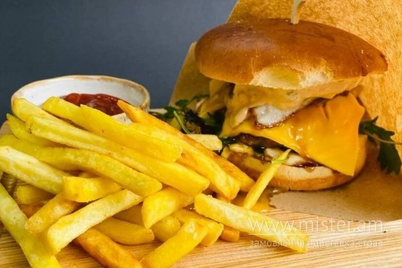 Нереально великий та смачний бургер з котлетою зі свинини, яйцем, беконом, сиром чеддер, солоним огірочком та міксом салату. Подається з картоплею фрі та кетчупом.