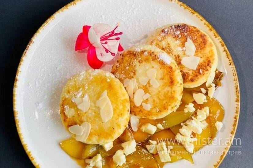 Ніжні сирники з карамелізованою медом грушою, сиром дорблю та мигдалевими пластівцями.