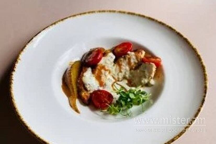 Ніжне філе курочки з карамелізованими грушами під соусом Бомбей та соусом на основі пармезану та дорблю.