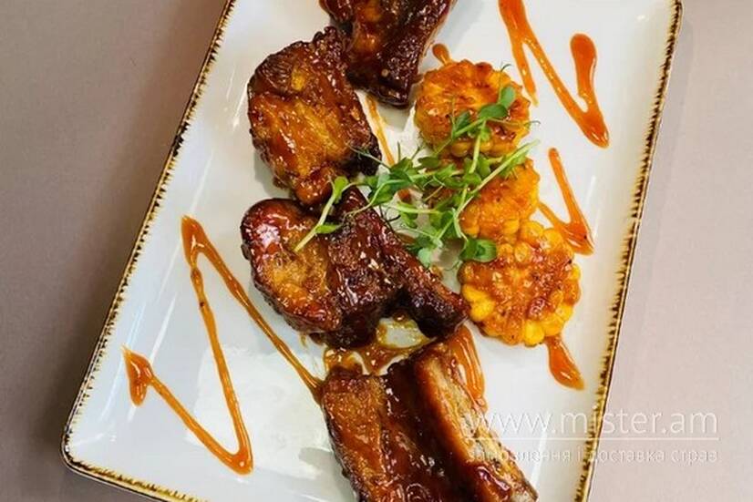 Соковите печене ребро із соусом BBQ та грильованою кукурудзою.