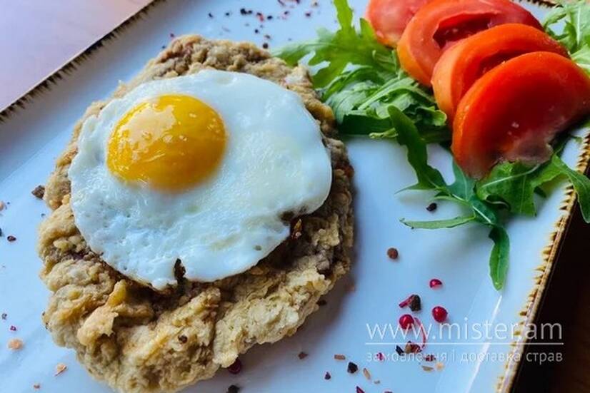 Шніцель зі свинини, подається з руколою, помідором та смаженим яйцем.