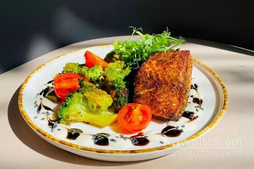 Соковитий та підрум`янений стейк з лосося. Подається разом з броколі.