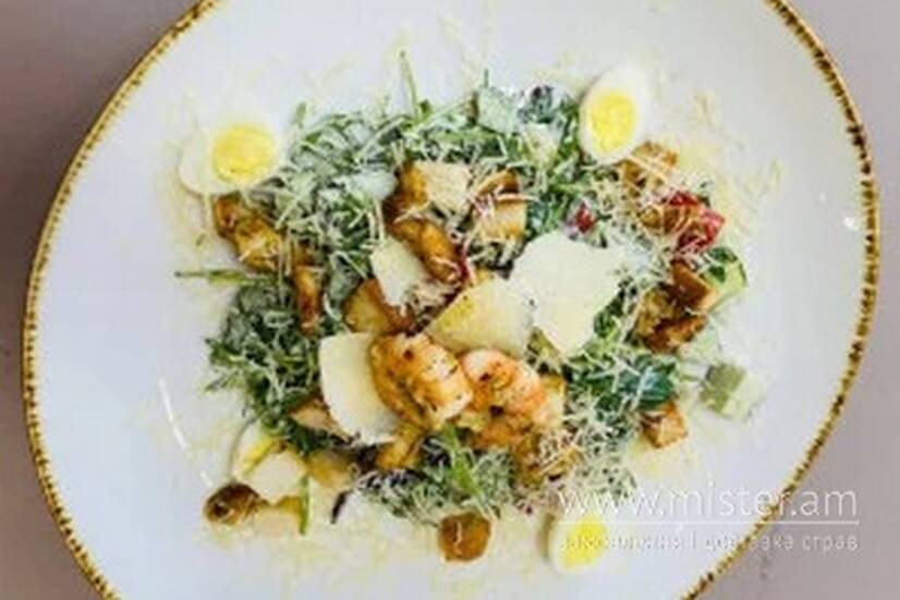 Салат з міксом салату, смаженою тигровою креветкою, беконом та перепелиними яйцями.