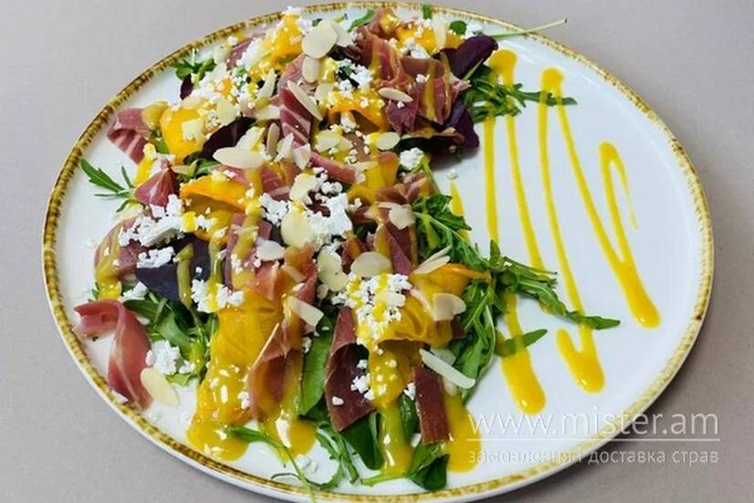 Салат з хамоном, фетою, сезонними ягодами чи фруктами, міксом салату та міксом горіхів.