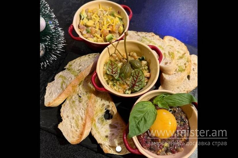 Тартар з телятини, тартар з лосося, тартар з креветки. Подається з чіабатою.