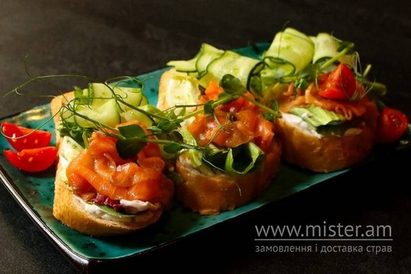 Грінки з чіабати, слабосолений лосось, крем-сир, мікс салату та свіжий огірок.