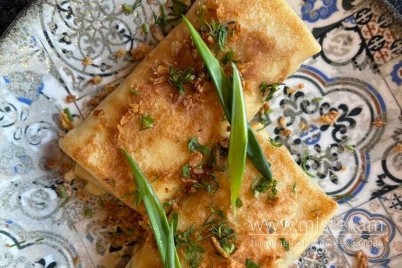 Млинці з начинкою зі смаженого курячого філе, печериць та сиру моцарелла.