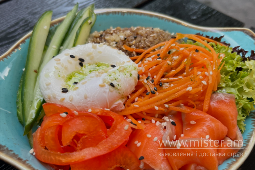 Кіноа, лосось слабосолений, яйце пашот, свіжий огірок, болгарський перець, свіжа морква, мікс салат, кунжут, соус теріякі