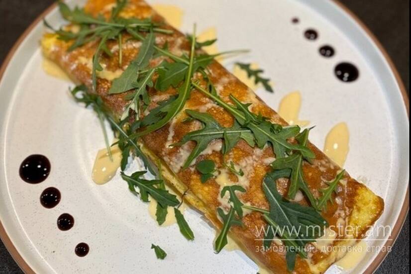 Яйця, молоко, сир Моцарелла, курка Су-від, руккола.