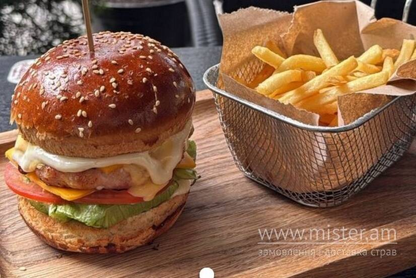 Булочка бріош, котлета з філе індички, свіжі томати, салат айсберг, сир чеддер, фірмовий соус. Подається з картоплею фрі.